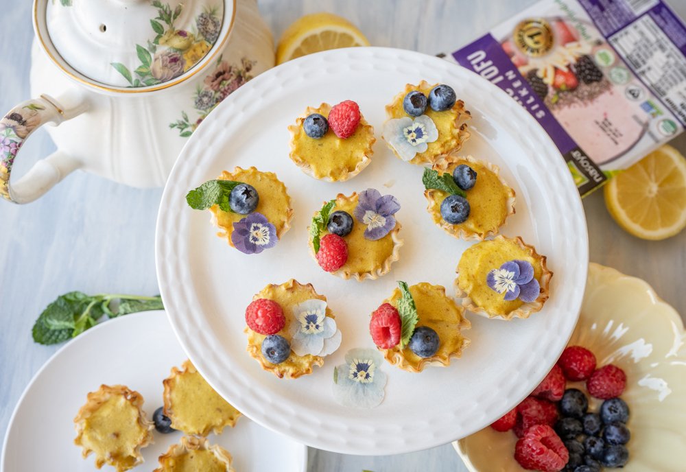 - Place the tartlet cups on a baking sheet and spoon the filling close to the top of each. Bake 10-12 minutes, or until a golden “skin” forms on the top and the filling appears set and is lightly firm. Move to the refrigerator and chill to let set, ideally for 1- 2 hours or more. Serve garnished as desired, such as with berries, edible flowers, and mint leaves.